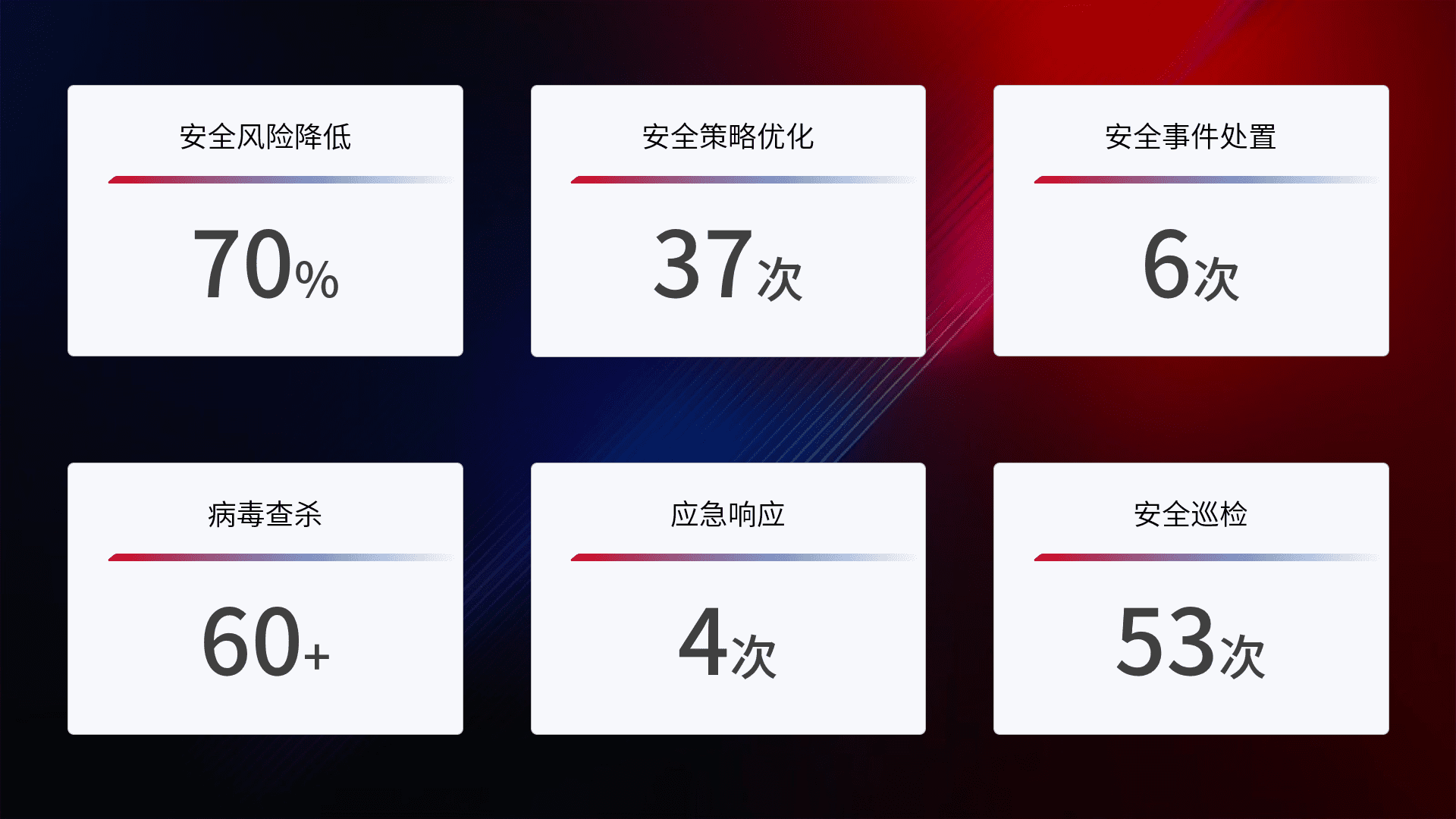 提供全面的安全事件报告体系,,,包括处置报告、、周报、、季度和年度总结,,结合持续监控,,,,帮助客户深入了解网络安全状况。。